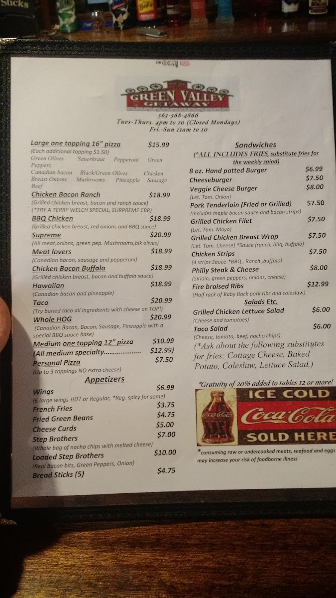 Welcome to Green Valley Getaway, a hidden gem nestled at 78 16th Ave NW, Waukon, IA. This charming establishment is celebrated for its hearty menu and warm ambiance, making it a perfect spot for both locals and visitors alike.